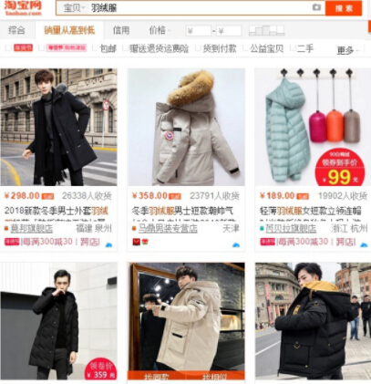 首先打开淘宝,我们搜索“羽绒服”,