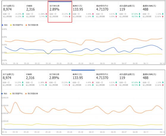 我们可以在生意参谋的首页看到你的综合支付转化率和客单价跟行业均值以及行业优秀对比的情况。如果你的转化率是高于行业均值的,那么你的客单价在达到行业均值的时候,你就是优秀的。